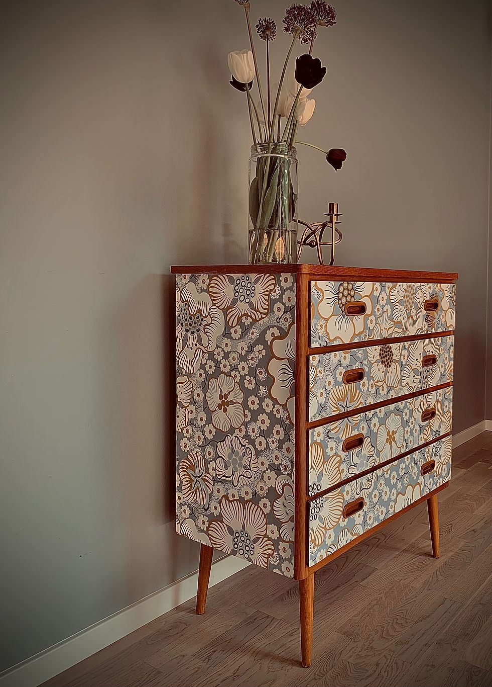 Vintage byrå i teak, fyra lådor tapetserad med ”Eldblomman”